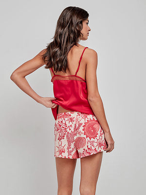 Il completo è composto da top leggero e pantaloncino coordinato (o pantalone corto), con linee moderne e colori freschi, in perfetto stile Gisela, sempre attenta a unire comfort e tendenza. La vestibilità è comoda e rilassata, studiata per non segnare e lasciare libertà di movimento, mentre il design femminile e curato nei dettagli lo rende perfetto non solo per dormire, ma anche per i momenti di relax in casa. Il top è stato realizzato nella tinta unita invece il pantaloncino con fondo bianco e stampa di conchiglie e coralli nello stesso rosso granata del top.